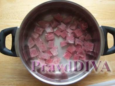 куски. Говядину и свинину залить холодной водой (1,5л) и поставить вариться (при