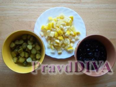 Добавляем соленые огурцы с рассолом, лимоны, маслины с рассолом, каперсы. По